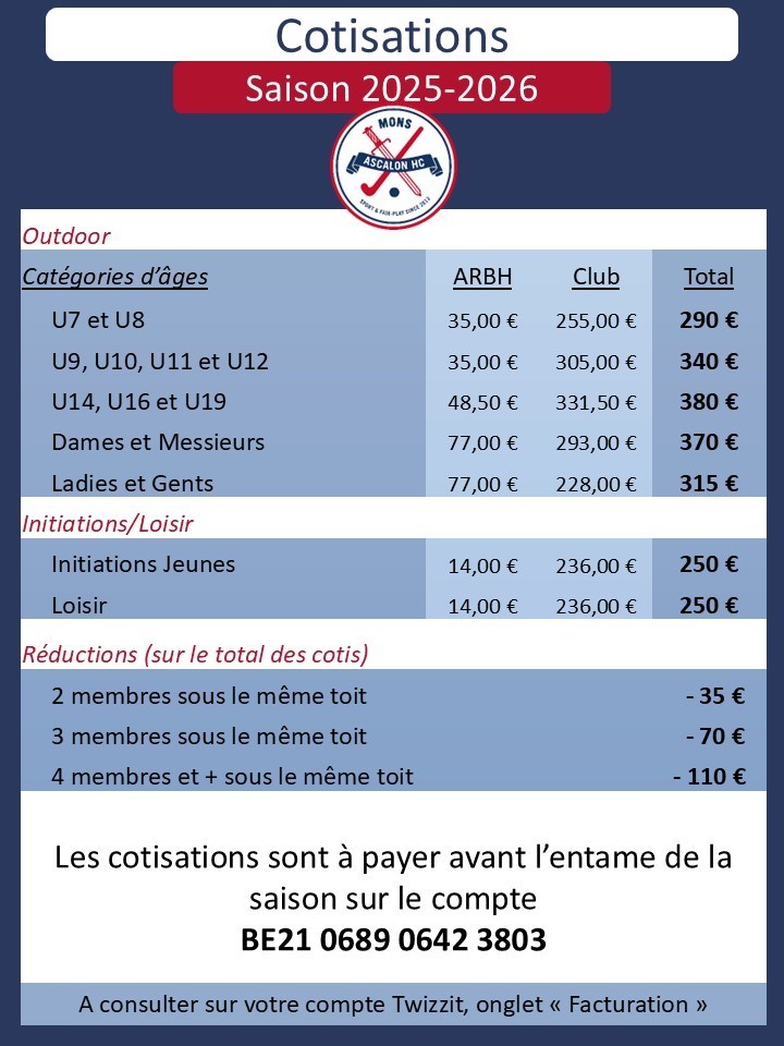 Les prix des cotisations pour la saison 2025/2026 sont repris ci-dessous. Les cotisations (qui ne dépassent pas les 7€ d'entraînement de l'heure) servent à couvrir les frais de la Fédé, les assurances, les infrastructures, les équipements et, surtout, à assurer un encadrement sportif optimal et performant pour faire progresser tous les joueurs et toutes les équipes.